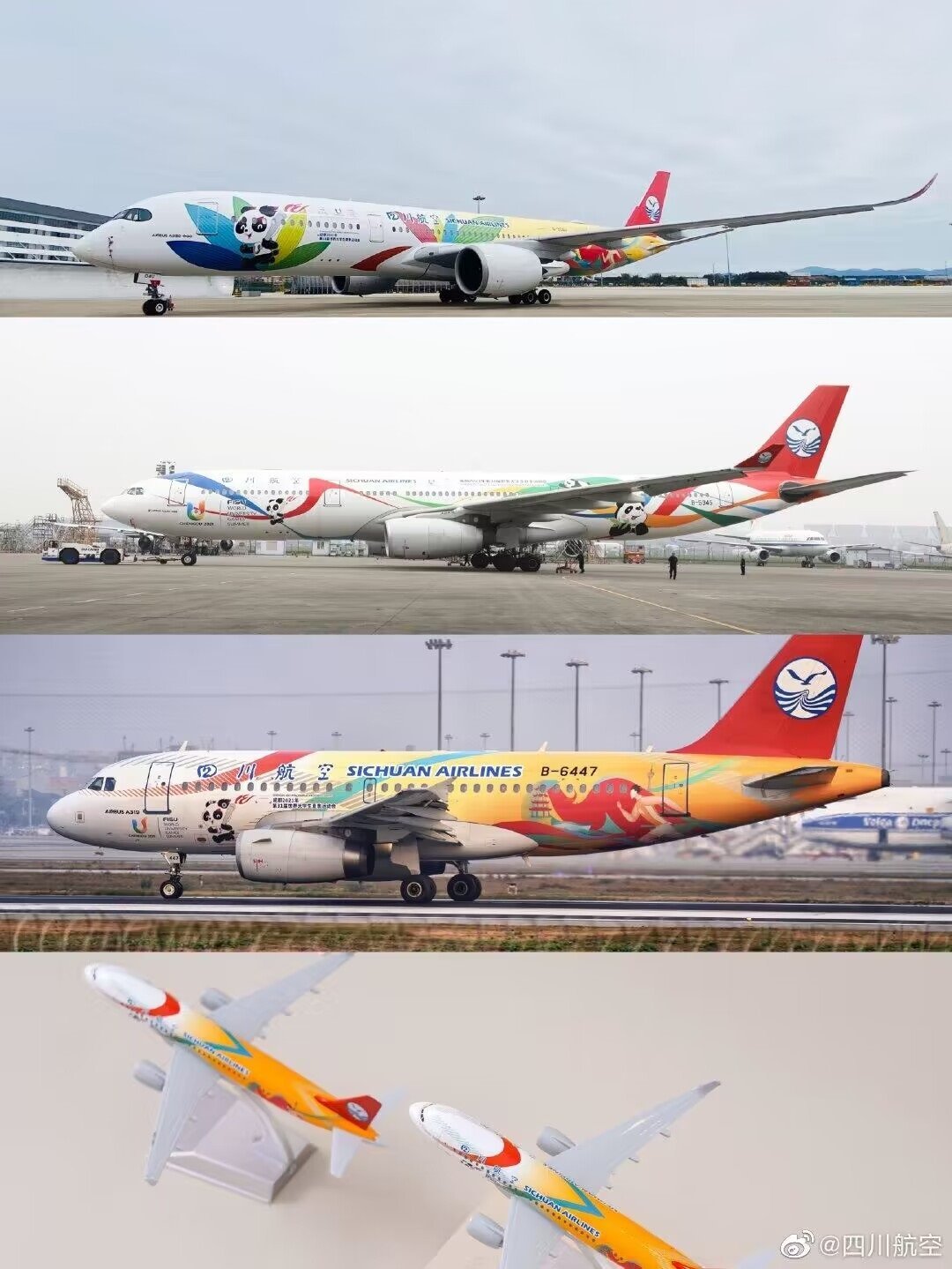 四川航空股份有限公司為成都大運(yùn)會(huì)量身打造的“大運(yùn)號(hào)”主題涂裝飛機(jī)。圖片來(lái)源:四川航空官方微博