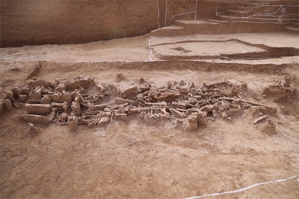 在“郭城”東南拐角處,發(fā)現(xiàn)一條殷墟時(shí)期的大型祭祀溝,長達(dá)19.36米,溝內(nèi)堆疊了3層人骨及動(dòng)物骨骼,初步清理出完整的人骨3具,以及肢解的牛骨、豬骨、馬骨、鳥骨等,經(jīng)動(dòng)物考古學(xué)家辨認(rèn)至少分屬17個(gè)動(dòng)物個(gè)體??脊趴碧竭€發(fā)現(xiàn)不同時(shí)期的道路遺跡穿過城壕,為探討洹北商城內(nèi)外部交通路網(wǎng)提供了重要線索。