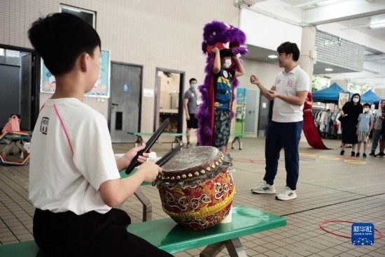 在香港漢華中學,小朋友體驗舞獅表演(6月18日攝)。