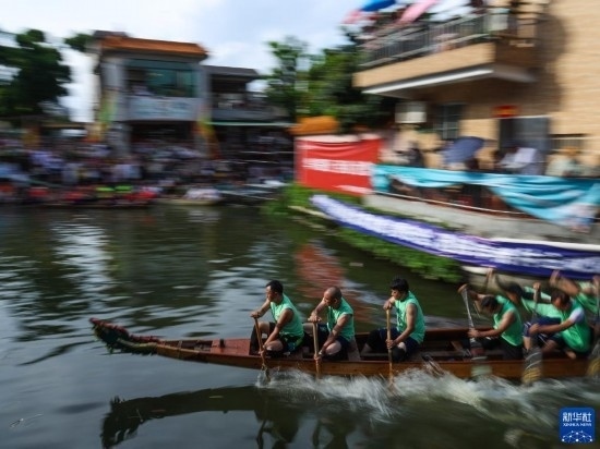 6月22日,“扒仔”(槳手)在佛山疊滘端午龍船漂移賽奮力揮槳,而舵手則穩(wěn)坐在船頭船尾。