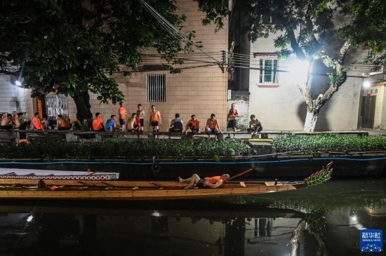 佛山疊滘東勝村的“扒仔”(槳手)在端午前堅持每天夜晚訓練,以求能在端午龍船漂移賽中展示最佳狀態(tài)(6月16日攝)。