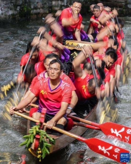 龍船漂移時,船頭船尾的舵手專門負責入彎出彎時的線路和速度控制(6月22日攝)。