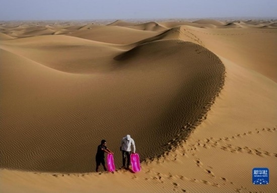游客在新疆喀什地區(qū)麥蓋提縣N39°沙漠旅游景區(qū)內(nèi)準(zhǔn)備體驗滑沙(9月7日攝)。