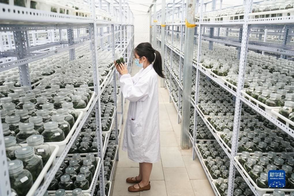 9月9日,技術(shù)人員在宿遷市王官集鎮(zhèn)蝴蝶蘭大世界查看瓶苗生長(zhǎng)情況。