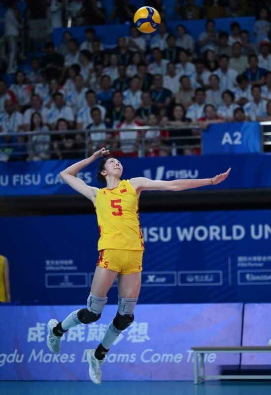8月6日,吳夢潔在第31屆世界大學(xué)生夏季運(yùn)動(dòng)會(huì)女子排球金牌賽中發(fā)球。新華社記者 胥冰潔 攝