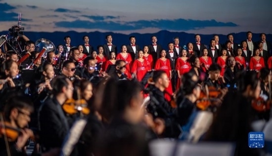 來自昆明聶耳交響樂團及昆明市民族歌舞劇院民樂團的演奏家們在昆明市滇池畔共同演奏包括《義勇軍進行曲》《賣報歌》在內(nèi)的聶耳代表作(7月17日攝)。