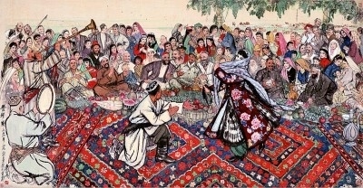 繞過(guò)紅色展墻,黃胄于1962年創(chuàng)作的《豐樂(lè)圖》赫然在目,拉開了展覽第一篇章的序幕?;▓F(tuán)錦簇的地毯上擺滿瓜果,人們圍坐在一起載歌載舞,歡慶豐收。畫面中的眾多人物雖姿態(tài)各異,但都喜笑顏開,感染著觀者。作品描繪出熱烈的慶祝場(chǎng)面,富有濃郁的地域特色,是新疆各族人民團(tuán)結(jié)和睦、意氣風(fēng)發(fā)的生動(dòng)寫照。