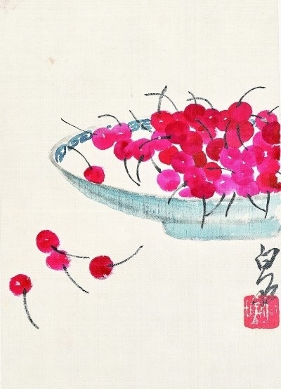 展柜中,不大的冊(cè)頁(yè)引得眾人圍觀。顆顆櫻桃被齊白石描繪得鮮嫩欲滴,它們擠在一個(gè)素樸的青花瓷盤中,還有幾顆散落在外,尤其鮮亮奪目。《盤中櫻桃》是齊白石《聚珍十開冊(cè)》中的一幅,作于20世紀(jì)30年代。在這套冊(cè)頁(yè)中,無(wú)論是荷花游魚、麥穗螞蚱還是汀渚魚鷹,都在齊白石筆下顯得格外逼真?zhèn)魃瘛?/p>