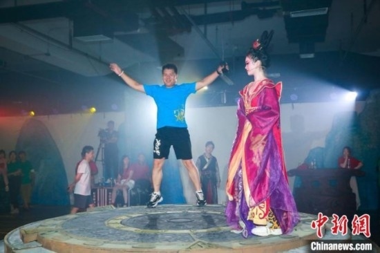 《猴王問(wèn)世》導(dǎo)演郝博介紹,這部戲提煉《山海經(jīng)》背景而創(chuàng)作,以金、水、木、火、土五行相生的順序,對(duì)應(yīng)白、藍(lán)、綠、紅、黃五個(gè)顏色,以及悲、恐、怒、喜、思五種情緒,與此相應(yīng)還有“后羿射日”“大禹治水”“刑天斷首”“夸父逐日”“女媧補(bǔ)天”五段神話故事?!爱?dāng)下年輕人的生活節(jié)奏快、壓力大,我們希望觀眾成為‘玩家’,通過(guò)‘參演’音樂(lè)劇《猴王問(wèn)世》,釋放壓力,丟掉情緒垃圾?!焙虏┱f(shuō)。