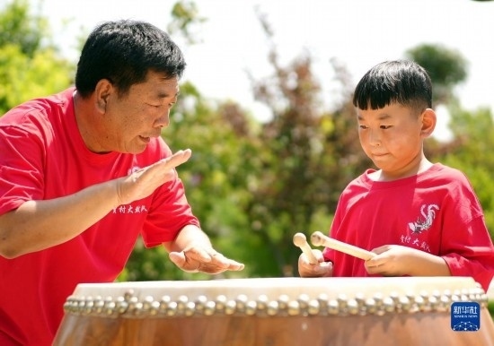 8月14日,在河北省滄州市滄縣舊州鎮(zhèn)賈村,大鼓藝人指導(dǎo)學(xué)生練習賈村大鼓。