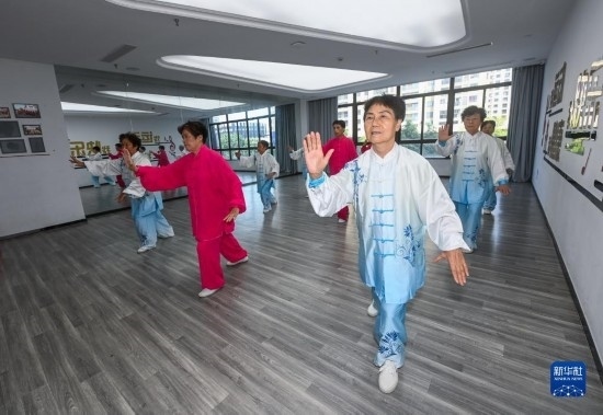 8月24日,在湖州市龍泉街道市陌河社區(qū),老人們在參加迎亞運(yùn)健身活動。