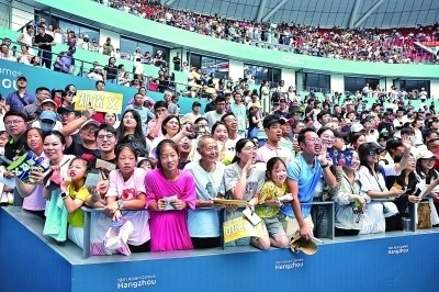 9月29日,杭州亞運(yùn)會(huì)網(wǎng)球女子單打決賽現(xiàn)場,觀眾在歡呼。本報(bào)記者陳城攝 光明圖片