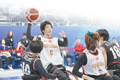 杭州亞殘運(yùn)會輪椅籃球女子金牌賽,中國體育代表團(tuán)運(yùn)動員張雪梅(左二)在比賽中。環(huán)球時報記者 崔 萌攝