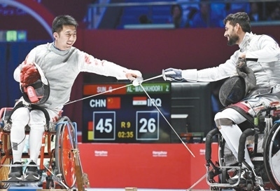 杭州亞殘運(yùn)會輪椅擊劍男子花劍團(tuán)體金牌賽,中國體育代表團(tuán)運(yùn)動員孫剛(左)與伊拉克體育代表團(tuán)運(yùn)動員友好示意。本報記者 王 亮攝