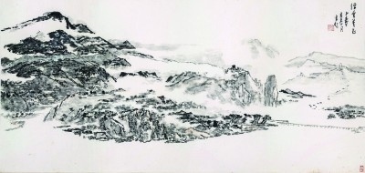 作為一名山水畫家,童中燾喜歡寫生。他的許多畫都是描繪云煙之境,浪奔濤涌,云蒸霞蔚,畫面多俯視視角,仿佛人立高處,視野遼闊?!堆闶幥飴埂贰对粕钏尚蕖贰短旃庠朴啊贰渡钌较φ铡贰@些如入無(wú)人之境的畫面里,山水充滿“靜凈”之氣,仿佛能夠感受到畫家手持紙筆,靜觀花開(kāi)花落、云卷云舒的從容心境。