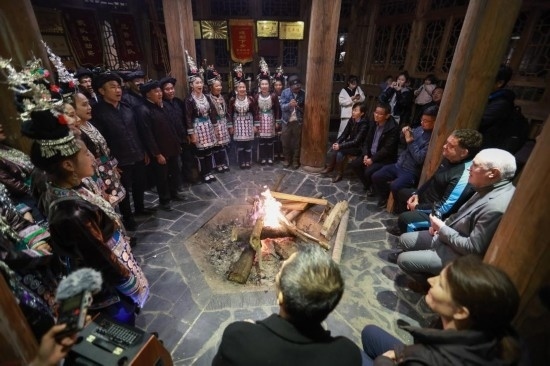 12月11日,榕江縣少數(shù)民族同胞用歌舞歡迎“學(xué)轉(zhuǎn)英超”培訓(xùn)團(tuán)隊。新華社記者 劉續(xù) 攝