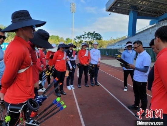 國家體育訓(xùn)練南方基地(海南白沙·綜合),一輪射箭之后,運(yùn)動(dòng)員在查看中靶情況。中新網(wǎng)記者王曉斌攝