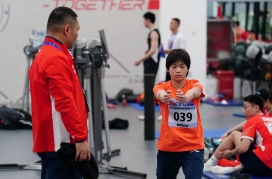 2023年12月29日,2023年國家隊冬訓體能大比武在國家體育總局訓練局舉行,來自射擊、舉重、田徑、游泳、跳水、花樣游泳、體操、蹦床、乒乓球、羽毛球等10支國家隊的150名運動員參加活動。圖為國家跳水隊運動員全紅嬋在測試前熱身。