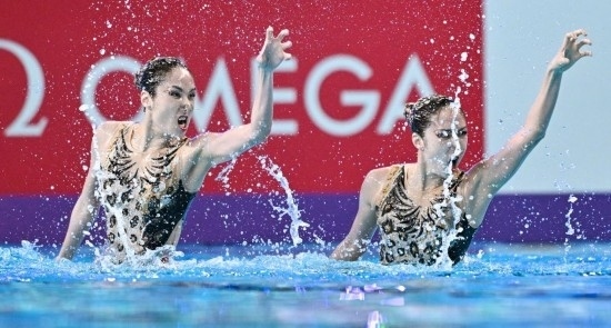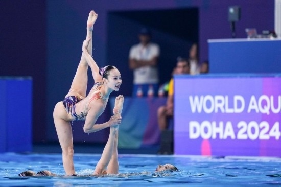 2月6日,中國(guó)隊(duì)教練張曉歡(左)、安娜在場(chǎng)邊觀賽。當(dāng)日,2024年世界游泳錦標(biāo)賽花樣游泳集體技術(shù)自選決賽在卡塔爾多哈舉行,中國(guó)隊(duì)獲得冠軍。新華社記者 夏一方 攝