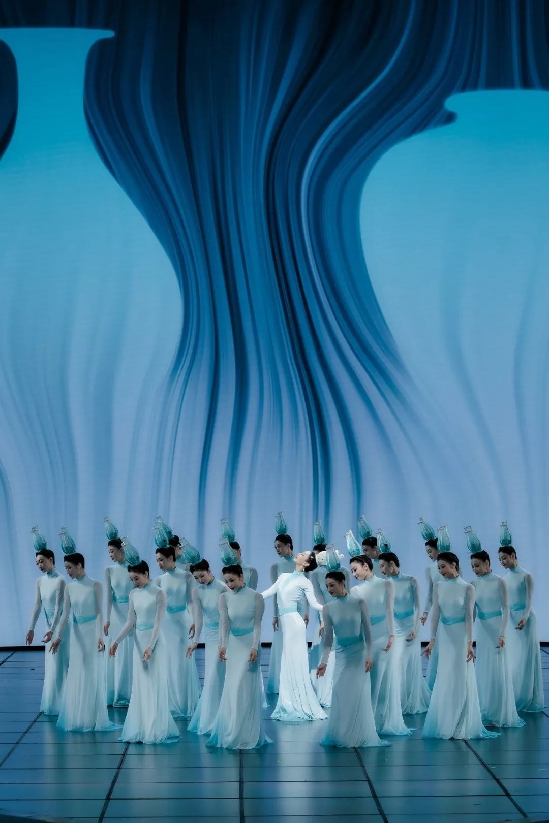 《瓷影》正是以青白瓷為視覺出發(fā)點,演出服裝在色彩上著墨,提取“青”“白”這兩種傳統“正色”,展現出大繁若簡的東方美學。通過舞者的肢體語言展現青白瓷跨越千年的獨特魅力。
