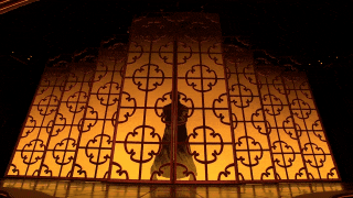 《詠春》來自舞劇《詠春》選段,已經上演了百場,但在春晚是個特別的版本。為了創(chuàng)造出更加意蘊豐富的想象空間,總臺臺長慎海雄在推薦這個舞劇片段時,提出了幾個建議,包括演員服裝從黑色的香云紗改為絳紅色,男女主角之間的關系要從男主角一一過招“大敗”女主角改為相互切磋武藝,開場以男主角的武術剪影來增強吸引力,通過使用剪影效果來展現“葉問”的出場。當燈光亮起,窗欞上“詠春拳”三個書法大字淡去,“葉問”的剪影如同舞動的水墨畫一般,隨即演員閃身舞出屏風,影子與真身共舞。由虛入實,由平面到立體,“剪影”的設計讓短短半分鐘的獨舞大大增加了層次感和觀賞性,為空曠的舞臺創(chuàng)造出一個“頂天立地”的葉問之影,視覺震撼瞬間放大,堪稱畫龍點睛之筆。