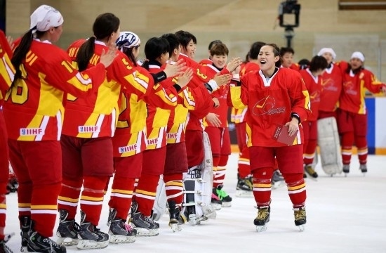 2015年4月11日,中國隊(duì)球員齊雪婷(右前)在獲頒本場最佳球員后與隊(duì)友擊掌慶祝。當(dāng)日,在北京舉行的2015國際冰聯(lián)女子冰球世錦賽甲級B組比賽中,中國隊(duì)以4比3戰(zhàn)勝意大利隊(duì)。新華社記者李明攝