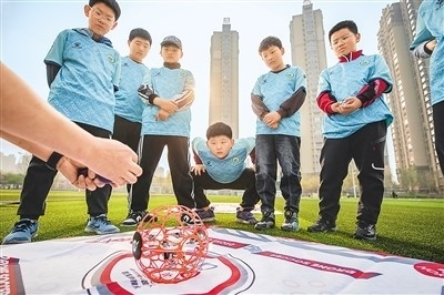 河北省唐山市豐南區(qū)胥各莊小學(xué)學(xué)生正在學(xué)習(xí)無人機(jī)足球操作要領(lǐng)。李福政攝(人民視覺)