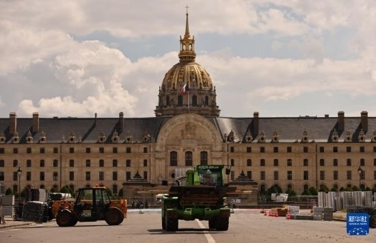 這是6月4日在位于法國巴黎市中心的榮軍院廣場拍攝的臨時比賽場地搭建現(xiàn)場。這里將在巴黎奧運會期間舉辦射箭比賽。新華社記者 高靜 攝