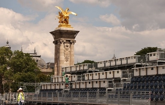 這是6月4日在位于法國巴黎市中心的亞歷山大三世橋拍攝的臨時比賽場地搭建現(xiàn)場。新華社記者 高靜 攝