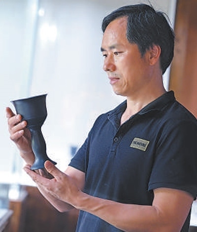 走進江西省靖安縣靖窯陶瓷展廳,古樸厚重的氣息撲面而來,展廳內陳列著各式瓶、罐,通體墨黑,散發(fā)著厚重溫潤的光彩。記者小心地拿起一個蛋殼黑陶高柄杯掂了掂,杯子看起來重,實際卻輕如薄紙。
