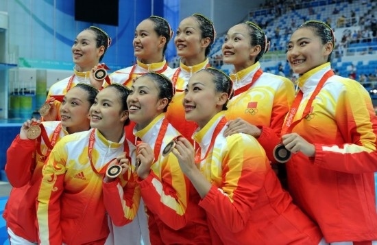 2008年8月23日,中國隊隊員在領(lǐng)獎臺上展示獎牌。當日,在國家游泳中心——“水立方”舉行的北京奧運會花樣游泳集體自由自選決賽中,中國隊以97.500分的總成績獲得該項目銅牌。新華社記者 王定昶 攝