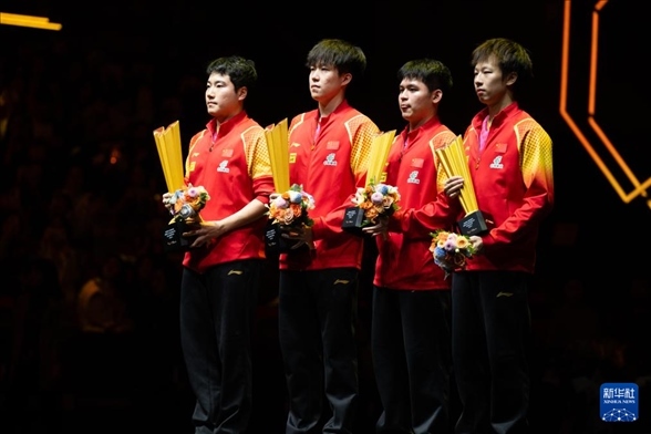 10月5日,冠軍王楚欽(左二)/梁靖崑(左一)和亞軍林高遠(yuǎn)(右一)/林詩棟在頒獎(jiǎng)儀式上。新華社記者 肖藝九 攝