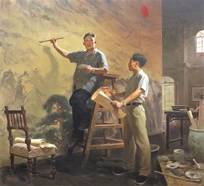 正在舉辦的第十四屆全國美術(shù)作品展覽進(jìn)京作品展上,撲面而來的藝術(shù)形象是腳踏中華大地的各族人民,是中國近現(xiàn)代文化史上的先賢圣哲,是和我們一道相擁而立的堂堂中國人。這些形象剛強(qiáng)勇毅,如潮如云,傳遞著眾志成城的精神力量,扣動人心。譬如,呂鵬《山河頌》,以濃郁的色調(diào),再現(xiàn)傅抱石、關(guān)山月兩位前輩創(chuàng)作《江山如此多嬌》的情景,鐫刻新中國美術(shù)史上重要一幕;鄔大勇《我心中的英雄》塑造了畫家少年時代的英雄偶像——錢學(xué)森等一代科學(xué)家。還有許多氣勢宏大的創(chuàng)作,它們既是社會生活、時代精神的藝術(shù)載體,又是美術(shù)工作者面對歷史、面對人民的激情熔爐。這些作品以人民形象為根基,深植時代沃土,構(gòu)成歷史與現(xiàn)實(shí)相輝映的史詩畫卷。