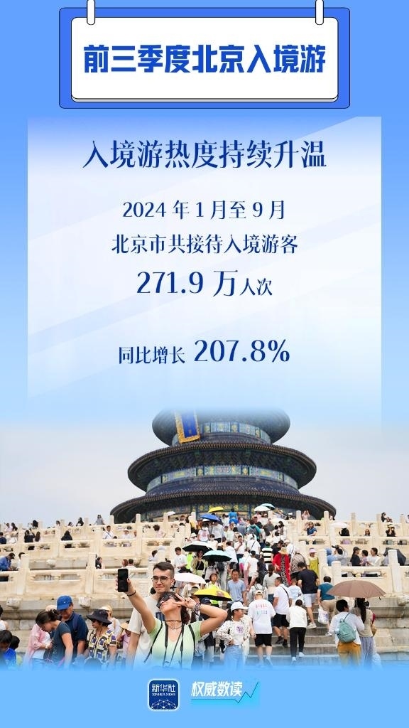 隨著中國免簽“朋友圈”持續(xù)擴容、便利人員往來措施不斷優(yōu)化,北京入境游市場加快恢復。北京市文化和旅游局日前發(fā)布數(shù)據(jù)顯示,2024年1月至9月,北京共接待入境游客271.9萬人次,同比增長207.8%。從單月恢復情況看,5月以來市場恢復速度加快,9月為年初以來的峰值,入境游客達38.4萬人次,增長趨勢明顯,正逐步接近2019年同期水平。