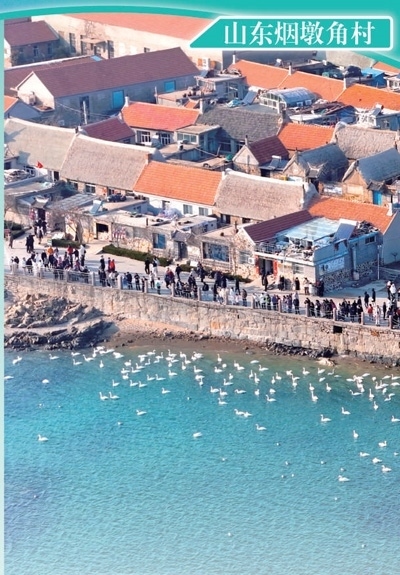 山東榮成市煙墩角村是亞洲最大的天鵝越冬棲息地,這個(gè)依山傍海的小漁村中建有傳統(tǒng)民居海草房。圖為游客們?cè)跓煻战谴逵^賞天鵝。楊志禮攝(影像中國(guó))