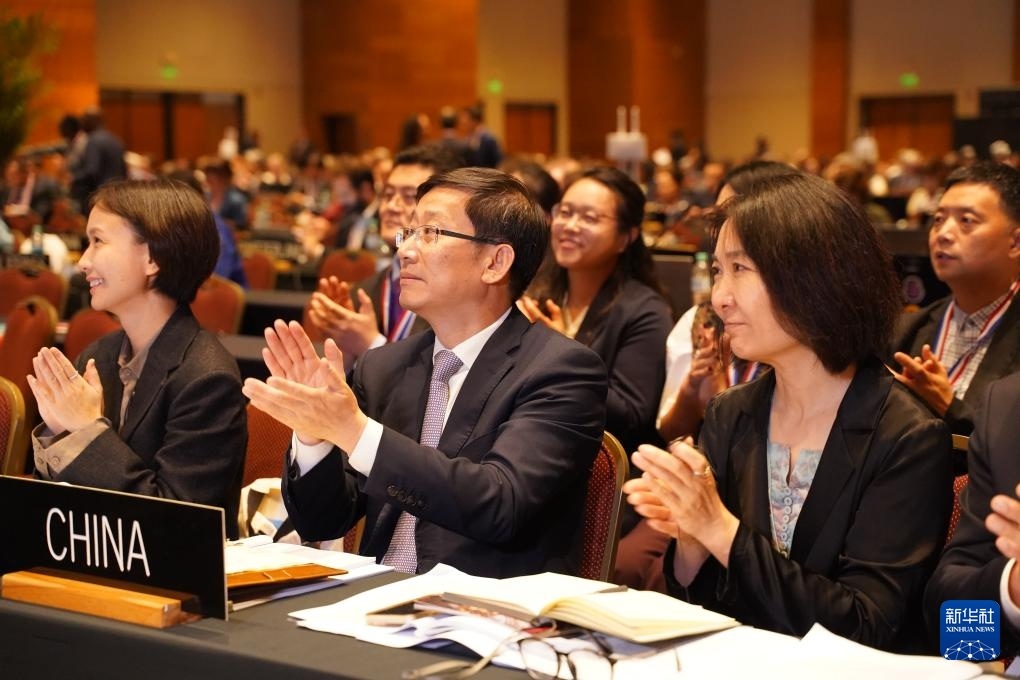 12月5日,在巴拉圭亞松森聯(lián)合國教科文組織保護非物質(zhì)文化遺產(chǎn)政府間委員會第19屆常會評審現(xiàn)場,中國代表團慶祝。新華社記者 朱雨博 攝