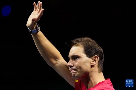 這是2024年11月20日,在西班牙馬拉加舉行的2024戴維斯杯男子網(wǎng)球團體賽四分之一決賽后,西班牙隊選手納達爾向觀眾致意。新華社記者 孟鼎博 攝