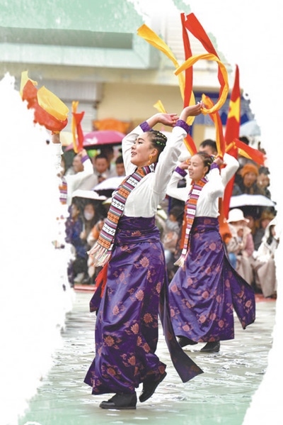 春節(jié)假期,每到傍晚時分,四川省阿壩藏族羌族自治州若爾蓋縣城中心的北上廣場都會準(zhǔn)時響起歡快的鍋莊曲,遠(yuǎn)道而來的游客與當(dāng)?shù)厝罕娨黄鹛饸g快的鍋莊。伴著音樂,鮮艷的長袖在風(fēng)中劃出道道弧線,腰飾隨著舞步搖曳,男女老少圍成一圈、翩然起舞。