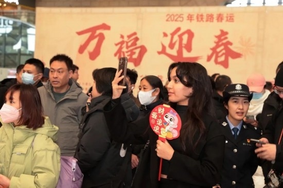 2025年鐵路春運“萬福迎春”活動現場,一位外籍旅客自拍留念。