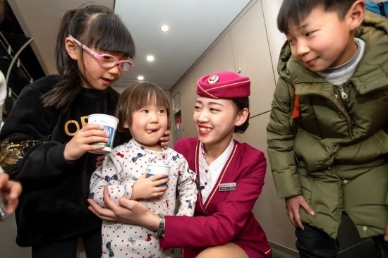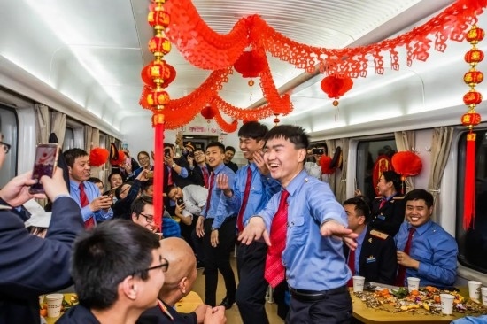 2月4日,臨客列車上的客運員與旅客一起聯(lián)歡。