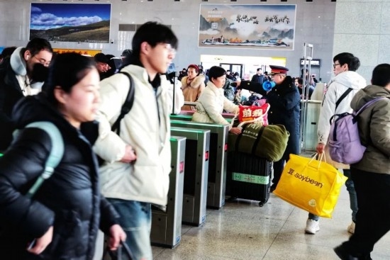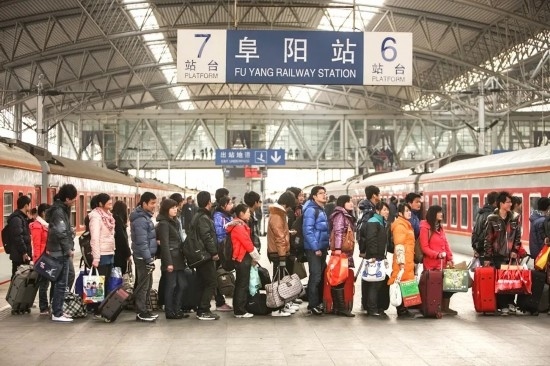 元宵節(jié)剛過,返程旅客在阜陽站排隊等候上車。