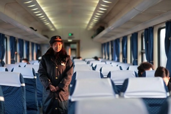 1月22日,K5209次列車上,新入路的“00后”乘務員在車廂內巡視。