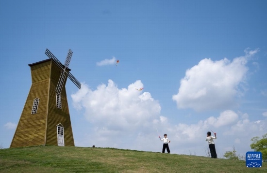 4月6日,在成都西湖公園,兩個小朋友在草地上放風箏。新華社記者 江宏景 攝