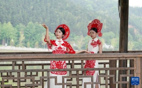 4月18日,演員在展示傳統(tǒng)剪紙。