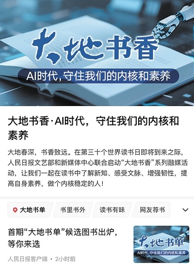 習(xí)近平總書記在今年全國兩會期間的重要講話中指出“書香是一種氛圍”“數(shù)字閱讀要和傳統(tǒng)閱讀結(jié)合起來,守住我們的內(nèi)核和素養(yǎng)”。在第三十個世界讀書日即將到來之際,人民日報(bào)社文藝部和新媒體中心聯(lián)合啟動“大地書香”系列融媒活動,并圍繞“AI時代,守住我們的內(nèi)核和素養(yǎng)”推出首期“大地書單”。來自出版、文藝、科技、教育等不同領(lǐng)域的20位薦書人,推薦出35本候選圖書,在人民日報(bào)客戶端“大地書香”專題予以集中呈現(xiàn),參照網(wǎng)友的評論與推薦,最終推選出10本上榜圖書。讓我們多讀書、讀好書,一起在氤氳著書香的大地上行穩(wěn)致遠(yuǎn)。