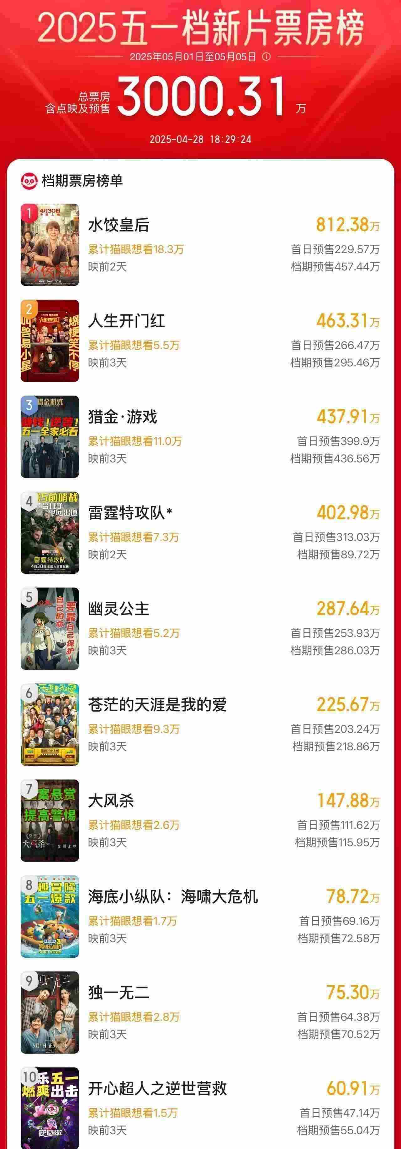 據(jù)網(wǎng)絡(luò)平臺數(shù)據(jù),截至4月28日18時(shí)29分,2025年“五一”檔新片預(yù)售總票房破3000萬,《水餃皇后》《人生開門紅》《獵金·游戲》分列前三位。