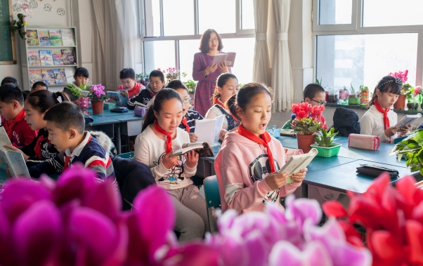 呼和浩特市通順街小學(xué)的學(xué)生們?cè)诶首x課文。
