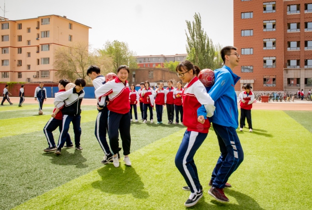 呼和浩特市第六中學(xué)的學(xué)生在操場(chǎng)上做趣味游戲。