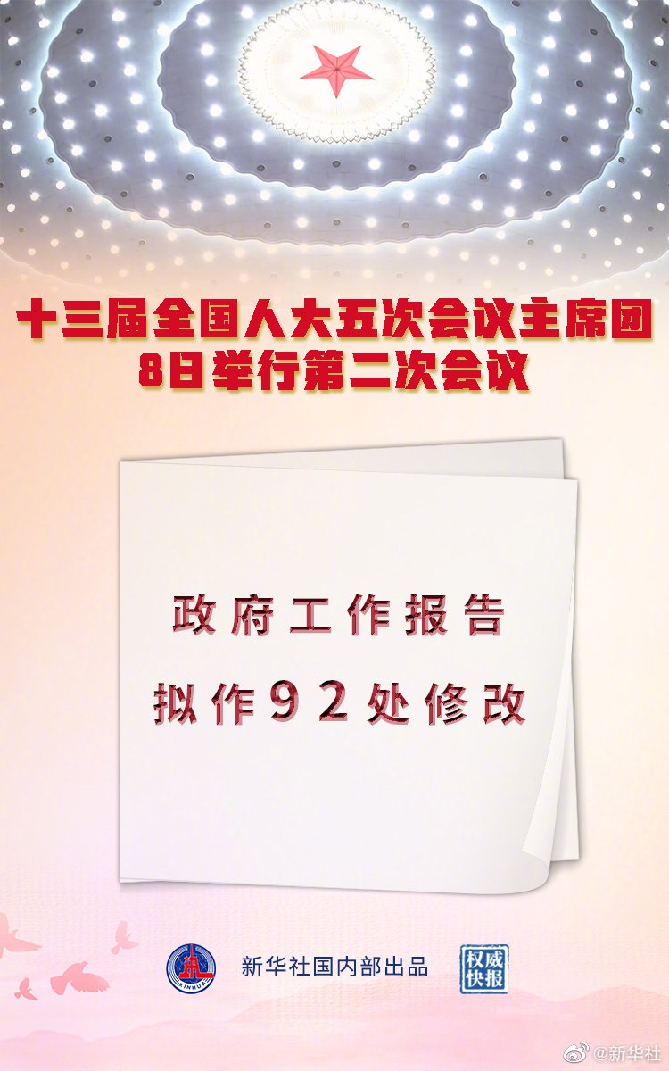記者8日從十三屆全國(guó)人大五次會(huì)議主席團(tuán)第二次會(huì)議上獲悉,政府工作報(bào)告擬作92處修改。