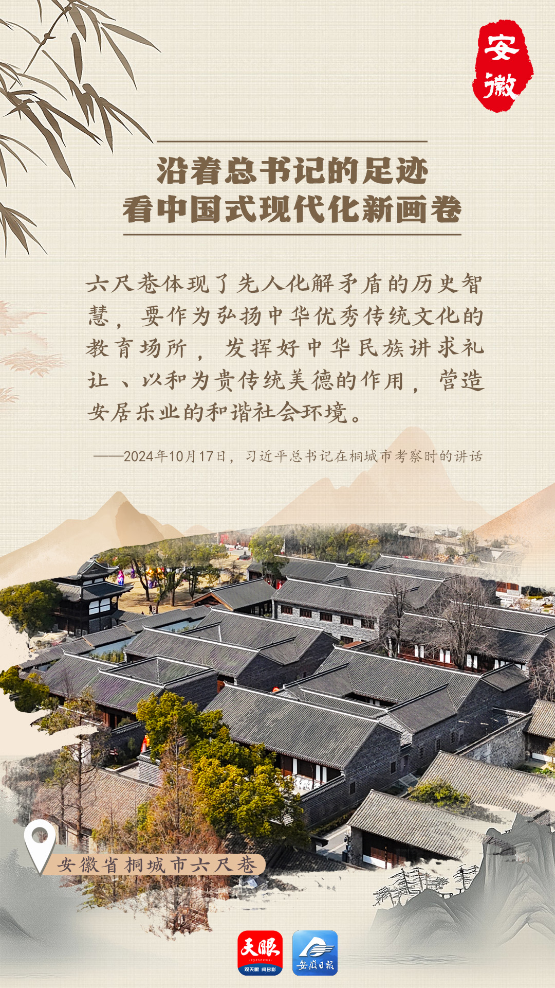 在桐城市六尺巷景區(qū),歷史與現(xiàn)代交織成一幅獨(dú)特畫卷。這里傳承三百多年的“禮讓文化”生生不息,文物在數(shù)字技術(shù)助力下“鮮活”起來。2024年10月17日,習(xí)近平總書記親臨桐城市考察并作出重要講話,為當(dāng)?shù)匕l(fā)展注入強(qiáng)大動力。